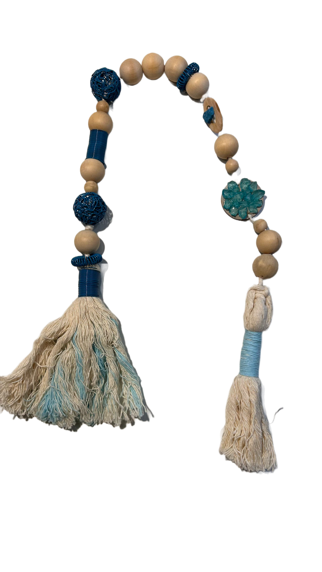 collar decorativo de mesas vasijas jarrones puertas ventanas etc con cuentas de madera y piedras de color turquesa.