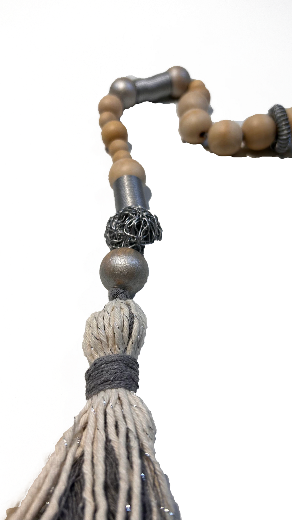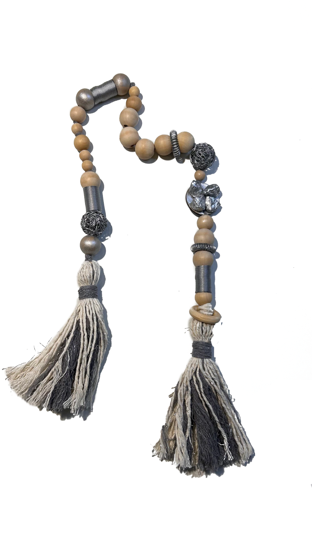 collar decorativo de mesas vasijas jarrones puertas ventanas etc con cuentas de madera y piedras de color plateado.