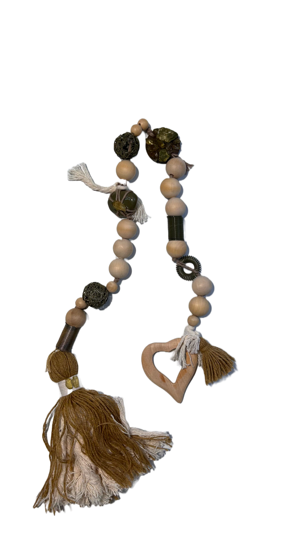 collar decorativo de mesas vasijas jarrones puertas ventanas etc con cuentas de madera y piedras de color verde.