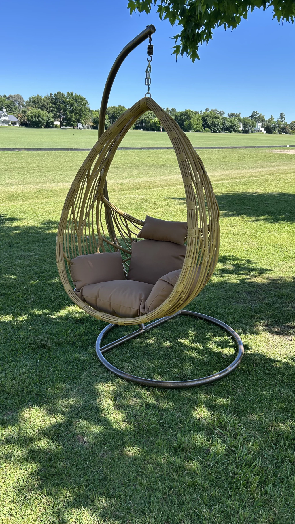 Gracias a su diseño versátil y elegante, es ideal para jardines, galerías, balcones o livings, integrándose fácilmente en distintos ambientes y estilos de decoración. La base circular metálica permite un balanceo suave y seguro, convirtiéndola en la elección perfecta para quienes buscan confort y diseño en un solo producto.