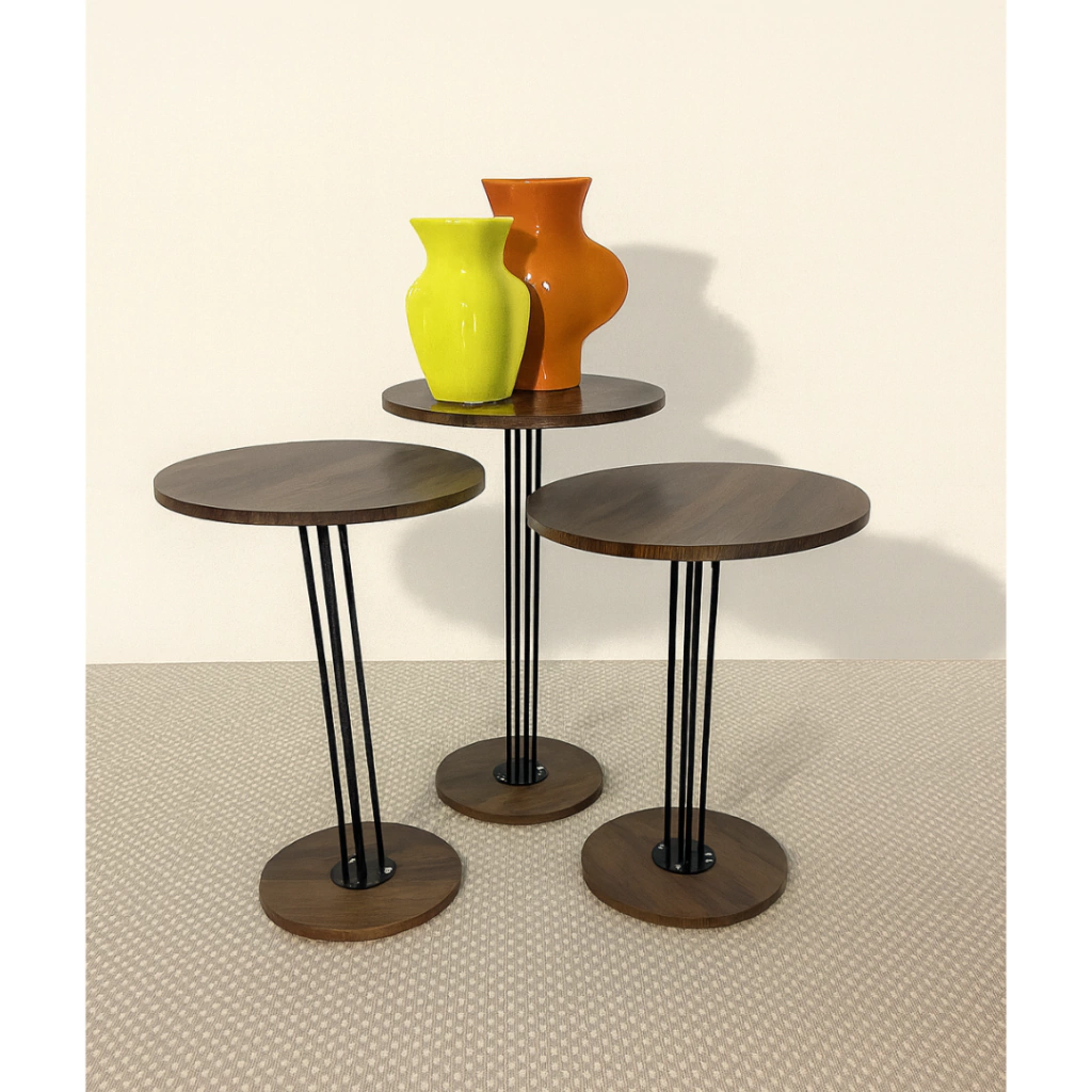 Con estructura de hierro y tapas enchapadas en nogal, este set de tres mesas en distintas alturas combina diseño y funcionalidad. Podés usarlas juntas creando un juego dinámico o por separado para acompañar distintos rincones. Un conjunto versátil que suma estilo y calidez a tus ambientes.