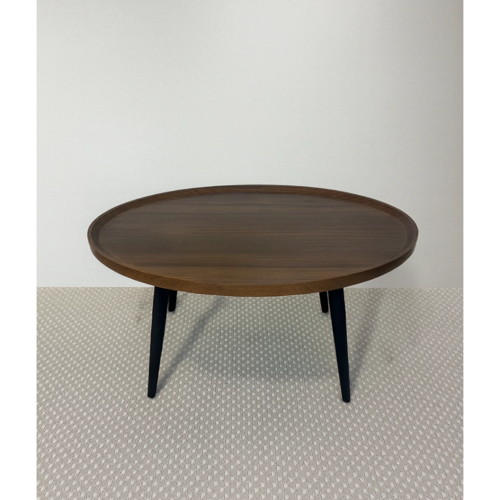 La tapa enchapada en nogal aporta calidez y elegancia, mientras que la estructura de hierro asegura resistencia y un toque moderno.