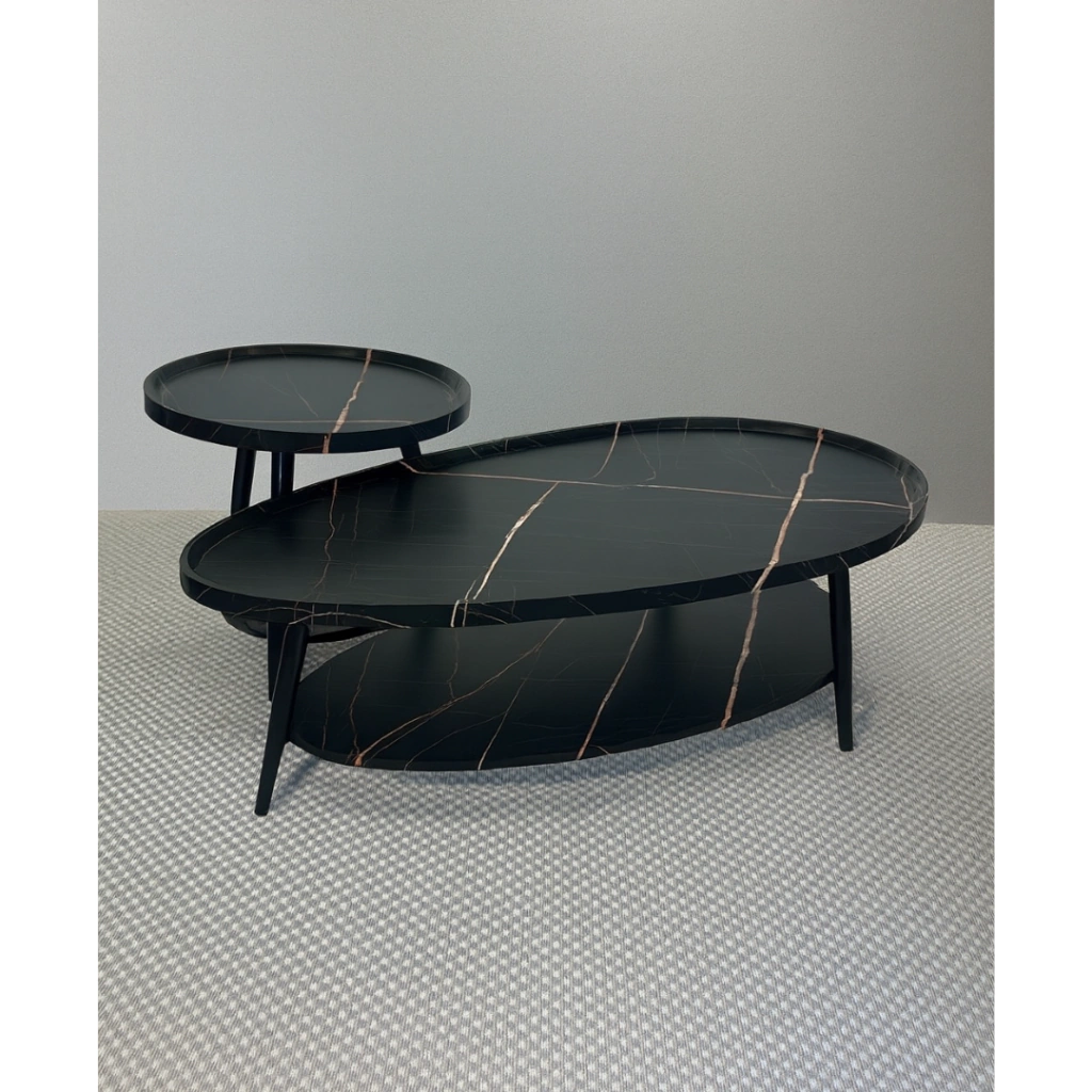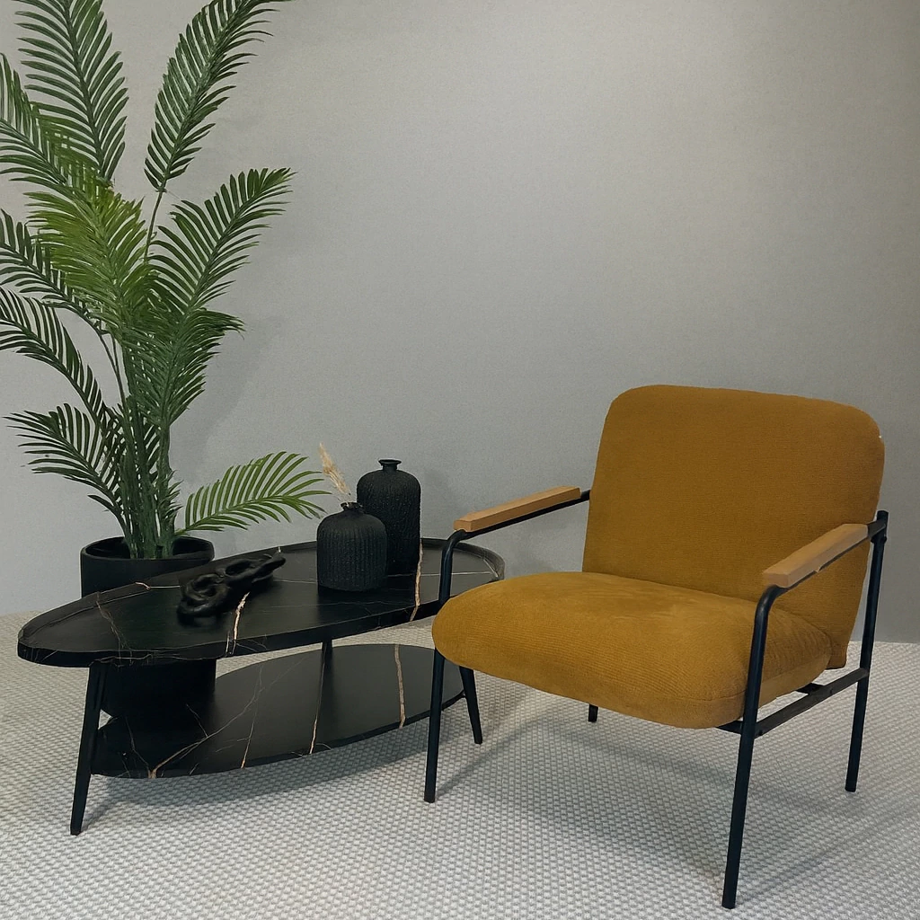 La tapa enchapada en marmol negro aporta elegancia, mientras que la estructura de hierro asegura resistencia y un toque moderno.