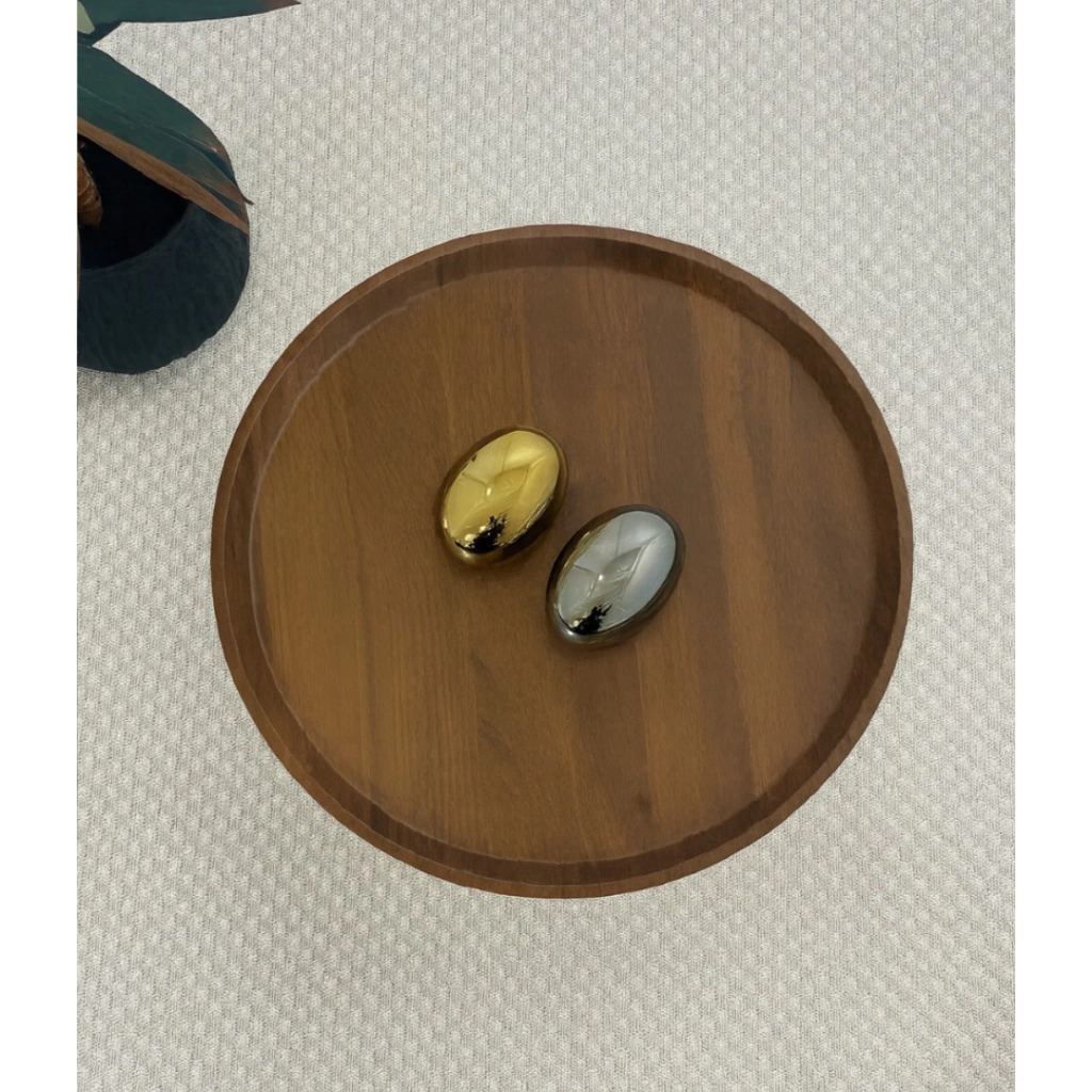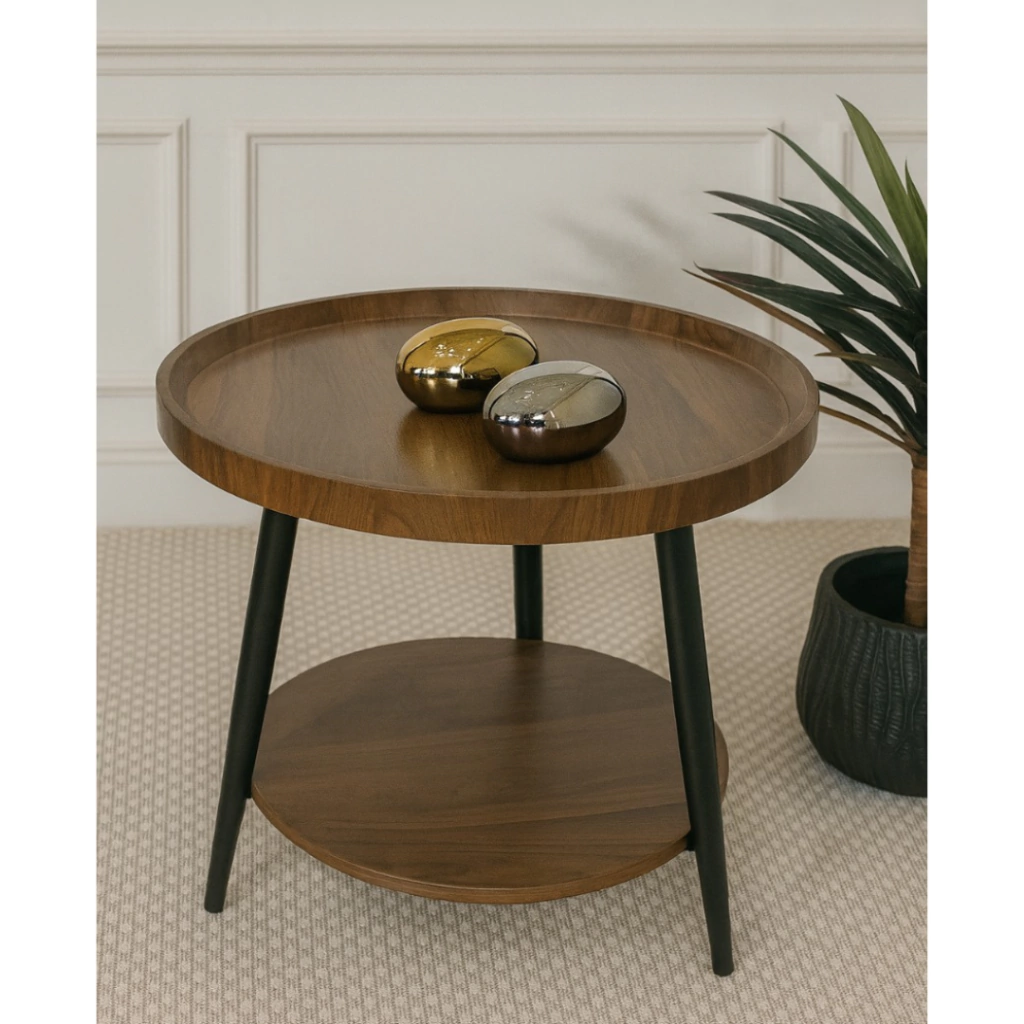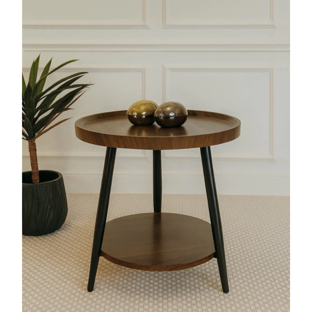 Mesa de noche con estructura de hierro resistente y tapa enchapada en nogal que aporta calidez y elegancia. Con dos niveles de estantería, ofrece espacio extra para organizar y decorar, combinando practicidad con un diseño moderno y sofisticado.