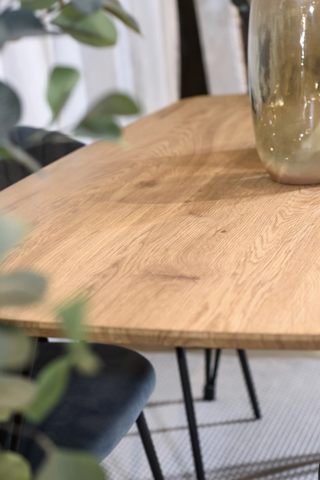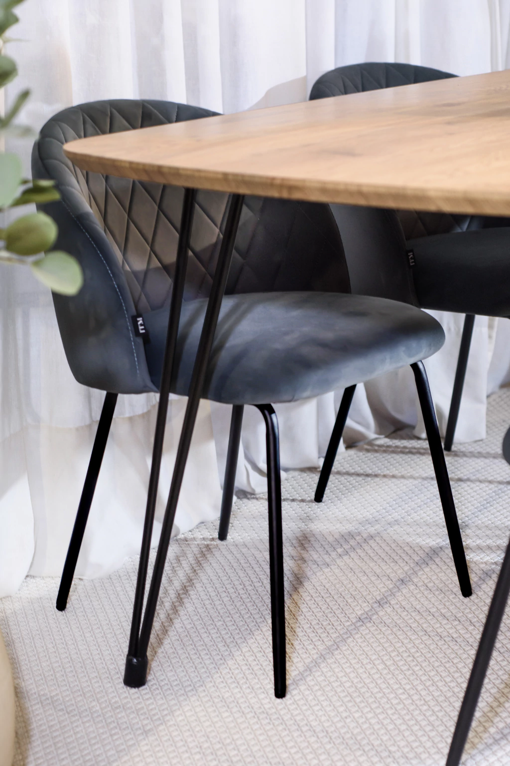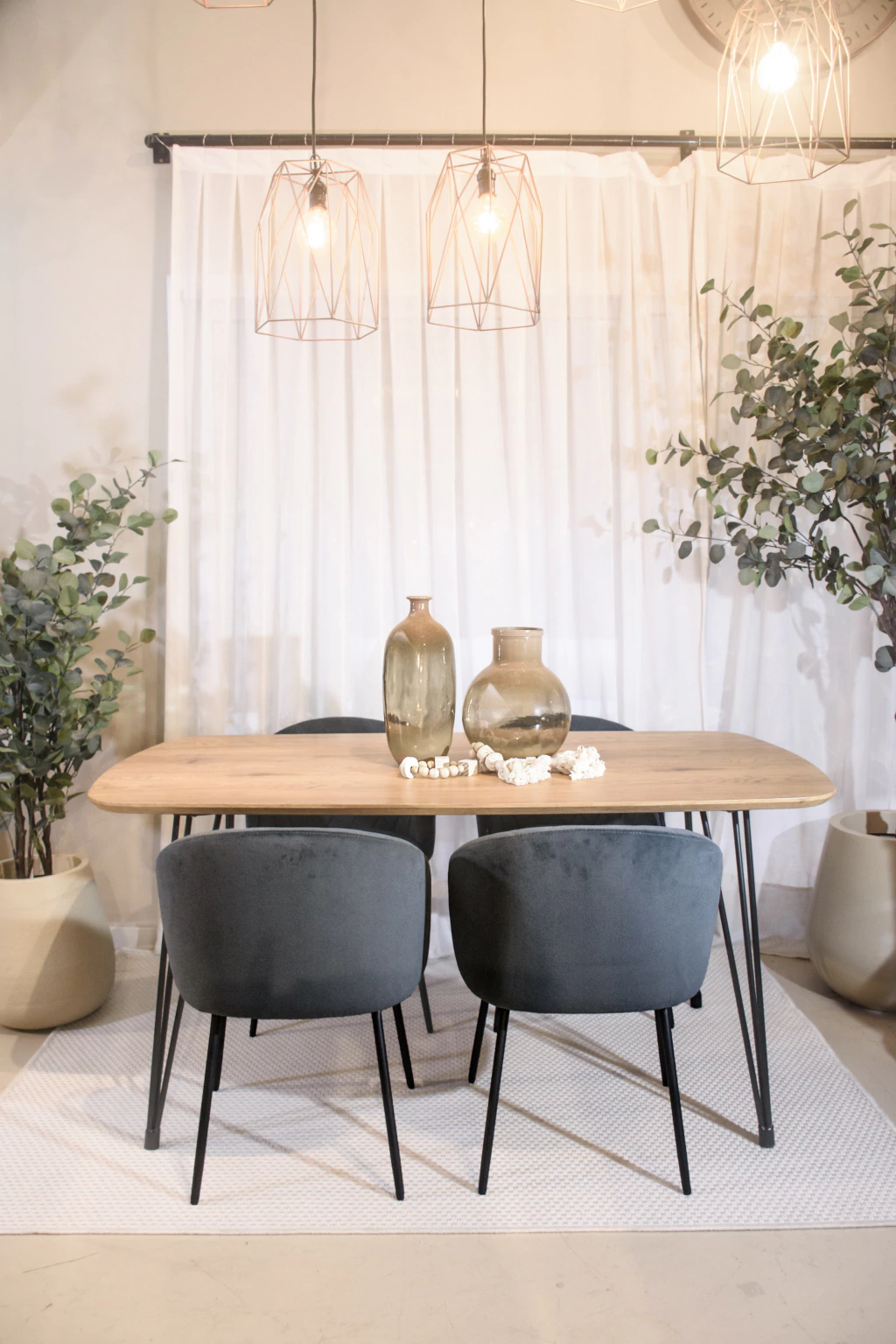 Esta mesa es una oda al diseño minimalista con una estética refinada y perfectamente funcional, donde cada detalle ha sido pensado para aportar elegancia sin excesos. Su tablero de enchapado simil madera contrasta sutilmente con las patas de metal negro en diseño tipo ‘hairpin’, brindando una apariencia ligera que se adapta a espacios modernos y contemporáneos. Ideal para el comedor o el estudio, su estructura resistente asegura estabilidad sin perder el estilo. Su estética limpia y líneas definidas convierten a esta mesa en el complemento perfecto para quienes buscan una pieza funcional que se destaque por su simplicidad y buen gusto. Perfecta para crear ambientes acogedores y bien iluminados, es una invitación a disfrutar de momentos especiales con estilo y comodidad.