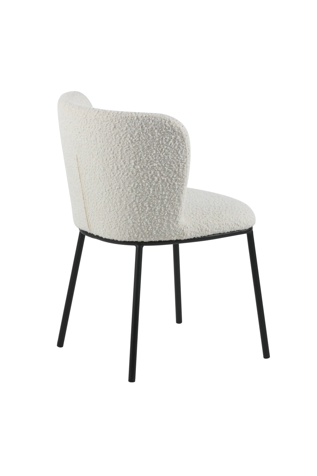 Esta silla presenta un diseño contemporáneo y elegante, ideal para añadir un toque de sofisticación a cualquier espacio. Con una estructura de patas metálicas en color negro mate, ofrece un contraste visual que resalta su asiento. El tapizado en tela bouclé premium de color blanco, aporta suavidad y confort además de sobriedad al diseño. Cálida y envolvente por su textura y el abrazo de su respaldo, esta silla posee un atractivo visual y táctil que alegra la vista e invita a un placentero reposo para el cuerpo. Pensada para brindar comodidad y practicidad sin olvidar el estilo, esta silla cuenta con un respaldo curvo que se adapta perfectamente a la espalda, proporcionando soporte y ergonomía. Su diseño sencillo pero refinado permite integrarla en comedores, oficinas o espacios de trabajo en casa, añadiendo un toque de distinción y detalle, imprimiendo una tendencia moderna. Es la elección perfecta para quienes buscan una pieza versátil que combine funcionalidad y el valor estético, convirtiéndose en un complemento ideal para cualquier ambiente sofisticado.
